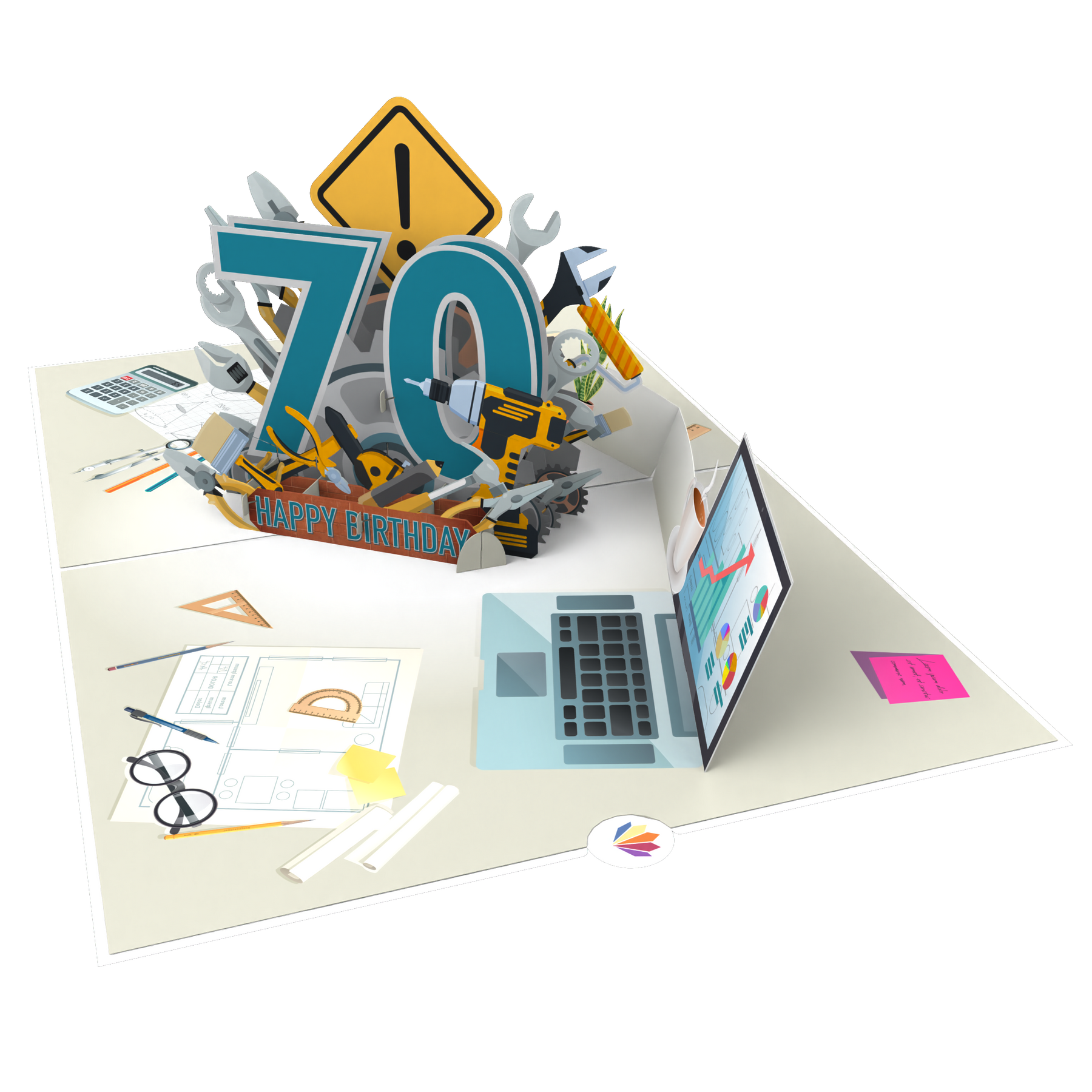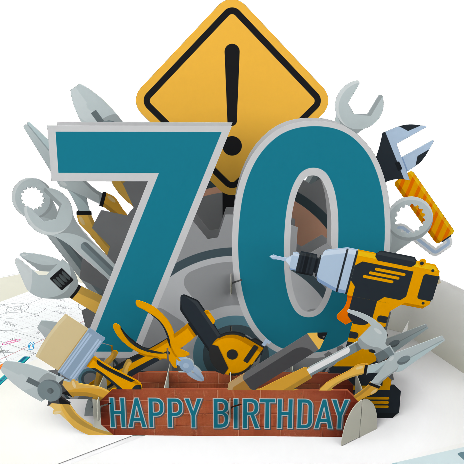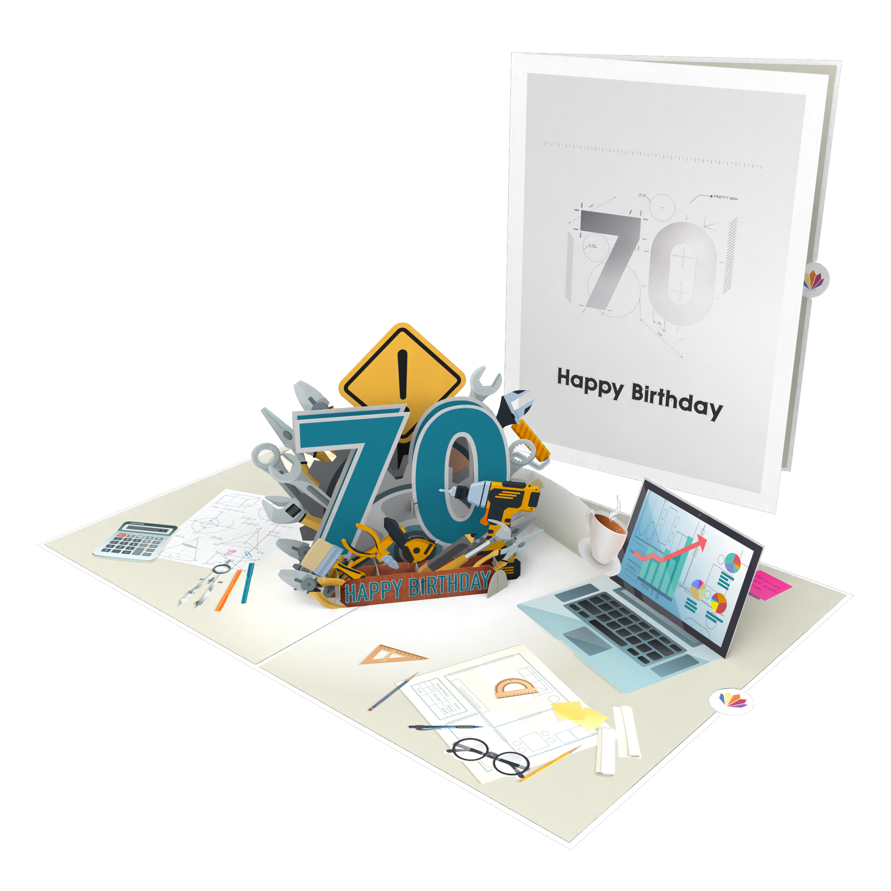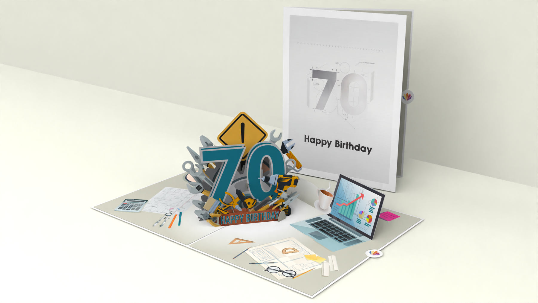 Diese hochwertige Grußkarte ist ein echter Blickfang. Das Zahnrad-Motiv mit der Zahl 70 und der Aufschrift "Happy Birthday" ist umrahmt von Werkzeug und verleiht der Karte einen einzigartigen Touch. Die Karte ist perfekt zum 70. Geburtstag für Männer aus dem Handwerksberuf oder Ingenieursberuf geeignet.